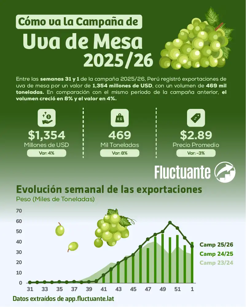 Cómo va la campaña de uva de mesa peruana 2025/26: Semanas 31 – 1 Entre las semanas 31 y 1 de la campaña 2025/26, las exportaciones de uva de mesa peruana alcanzaron un valor de 1,354 millones de USD,...