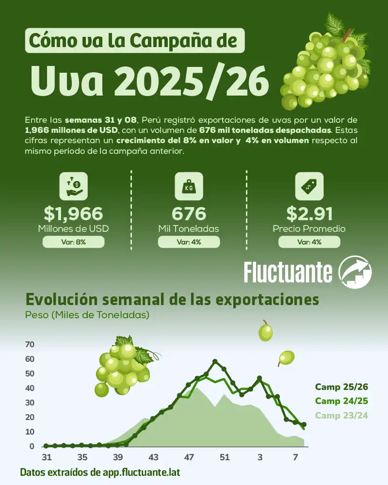 C贸mo va la campa帽a de uva peruana 2025/26: Semanas 31- 08 Entre las semanas 31 y 08 de la campa帽a de uva peruana 2025/26, los env铆os alcanzaron los 1,966 millones de d贸lares, respaldados por un volumen...