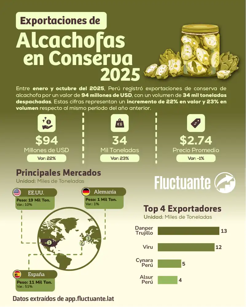 Entre enero y octubre del 2025, Perú registró exportaciones de conserva de alcachofa por un valor de 94 millones de USD, con un volumen de 34 mil toneladas despachadas. Estas cifras representan un incremento de 22% en valor y 23% en volumen respecto al mismo período del año anterior. Este crecimiento se explica por un […]