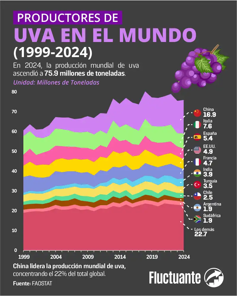 En el año 1999, Italia se consolidaba como el principal productor mundial de uva, respaldado por una larga tradición agrícola y una industria vitivinícola altamente desarrollada. Si bien el país mantiene una posición relevante en el escenario internacional, el liderazgo ha sido desplazado progresivamente por China, que actualmente concentra cerca del 22% de la producción global. Este avance responde, principalmente, a la adopción de tecnologías productivas como la agricultura protegida, el uso de nuevas variedades y la expansión de las áreas cultivadas.