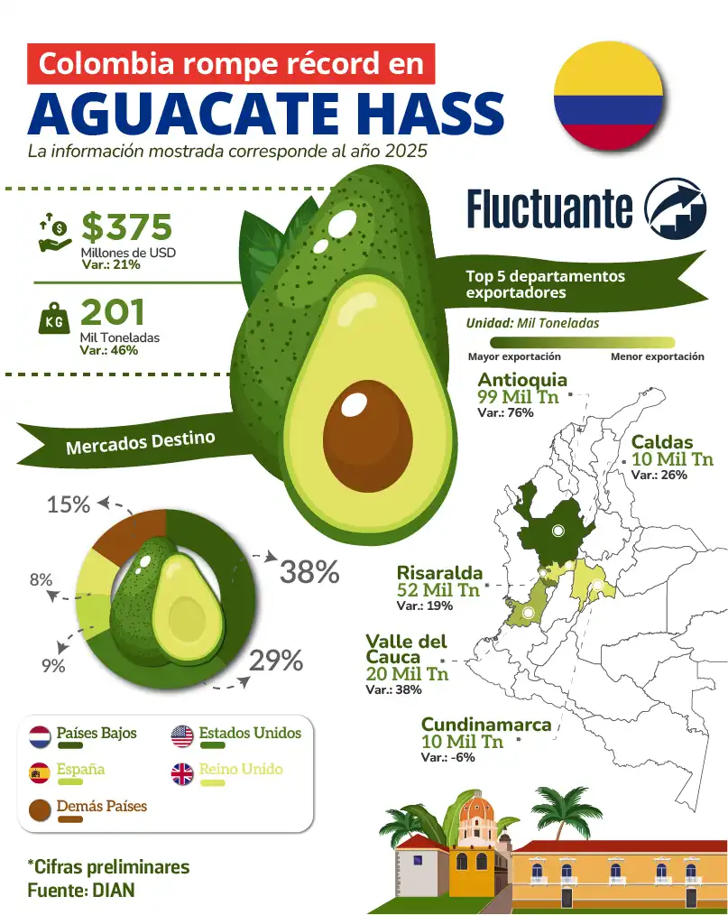 La campaña de aguacate Hass en 2025 cierra con cifras históricas para Colombia. El país exportó 201 mil toneladas de esta fruta, equivalentes a 375 millones de dólares, lo que representa un crecimiento del 46% en volumen y del 21% en valor respecto al año anterior. Estos resultados no solo reflejan un mercado en expansión, […]